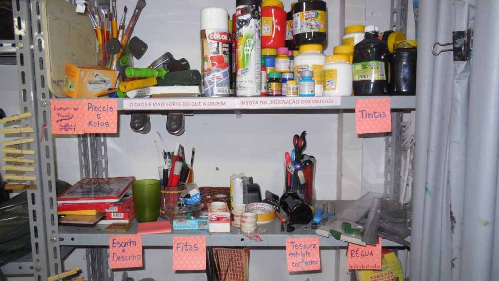 E, de novo, pouco adianta produzir um ordenamento que não se enraíza no espaço, e ao primeiro uso se desmancha sem deixar rastros para serem percebidos próximas pessoas. É preciso então explicitar, registrar o “óbvio”: debaixo de uma pilha de pincéis e rolos, afixar a etiqueta: “pincéis e rolos”. Porque a etiqueta não sai dali, e mesmo com a prateleira vazia você sabe onde devem ir os pincéis, e que eles vão junto dos rolos.