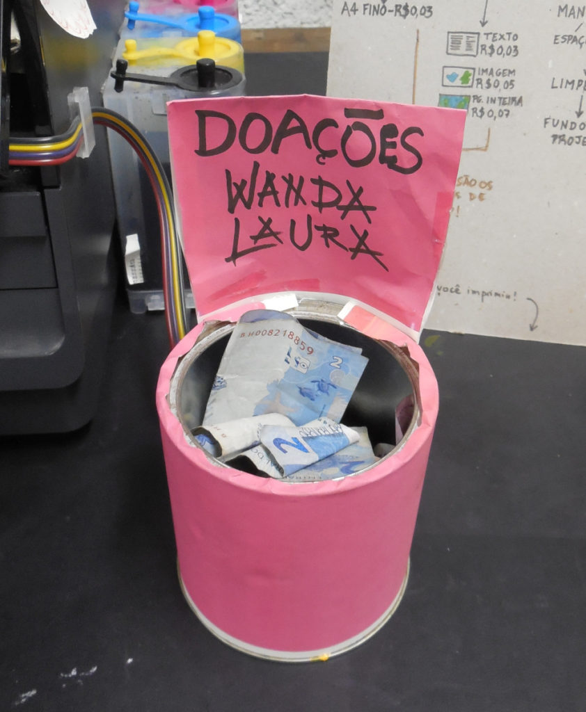 Por um lado, a placa com o preço da impressão só dispõe os custos mínimos de reposição do material, de forma que qualquer contribuição a mais é doação voluntária. Todos os trabalhos dos “anfitriões” – desde repor papéis até consertar as máquinas – não são precificados naquele pagamento que se faz ao potinho. Ao pagar a impressão, você paga preços de custo como se comprasse diretamente do fornecedor, de forma que aquele pote é apenas o intermediário de uma grande compra coletiva. O custo da impressão fica por isso tanto baratíssimo como intrigante. Mesmo a pessoa com o orçamento mais limitado se vê ali pagando um pouco a mais, para ajudar o espaço. Esses poucos centavos a mais definem concretamente uma relação: a pessoa tem uma dívida que não pode ser quitada em dinheiro.