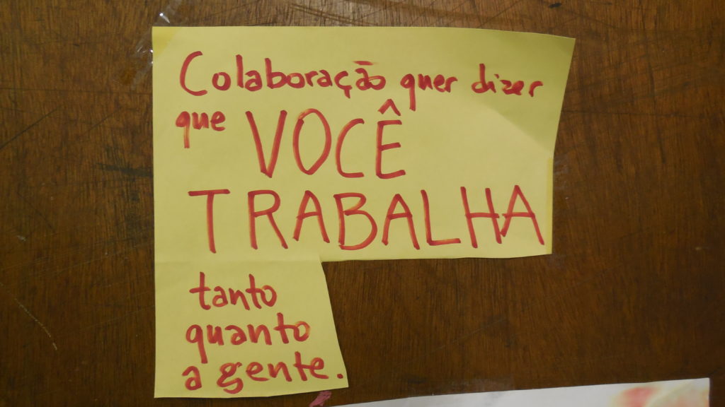 “Colaboratório” parecia perfeito mas logo passamos pela cena de alguém vir “colaborar” mandando a gente imprimir uma produção sua. Eu logo exclamei “Só te ajudo, só trabalho pra você, se você estiver aqui trabalhando tanto quanto eu!”. E percebendo que isso podia ser uma definição importante, colamos ela na entrada.