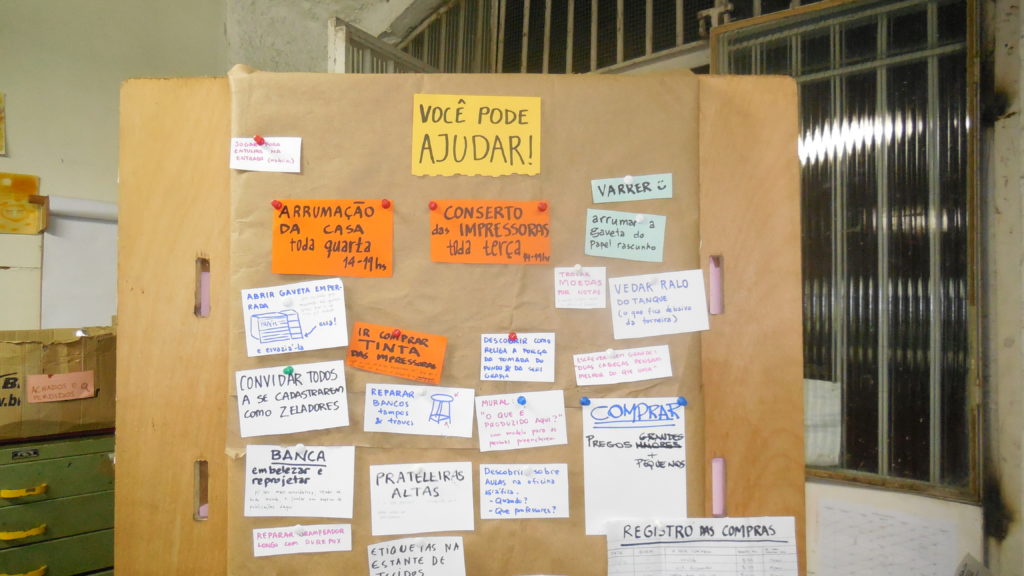 Abrimos o Colaboratório assim, e logo foi surgindo um fluxo crescente de frequentadores mais ou menos cientes do caráter voluntário do projeto e da necessidade que temos de envolvimento de mais pessoas. Quando voltávamos a nos reunir, na 4ª feira seguinte, era sempre uma surpresa enfrentar os resultados do uso autônomo. Sempre havia folhas soltas pelo espaço; a gaveta de papéis estava um caos; as ferramentas (tesoura, cola, estilete) pelas mesas; restos pelo chão… Nós arrumávamos tudo, varríamos, resmungávamos, fazíamos piada sobre a bagunça e nos púnhamos a pensar: como construir aos poucos um processo coletivo sustentável, uma cultura tanto de uso como de cuidado do espaço e desses meios de produção?