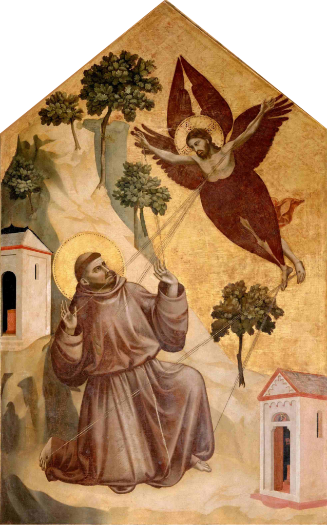 Em 1224 São Francisco de Assis andava no final de sua vida. Quase inteiramente cego, retirou-se no Monte Alverne (Toscana) parar orar, jejuando e prostrando-se em solidão, quando, em 14 de Setembro, entrou em um transe profundo. De joelhos no chão e mãos em sinal de entrega, recebeu as cinco chagas transmitidas de um Cristo ofuscante, ao mesmo tempo crucificado e voador, o Cristo Seráfico que apareceu sobre os montes.