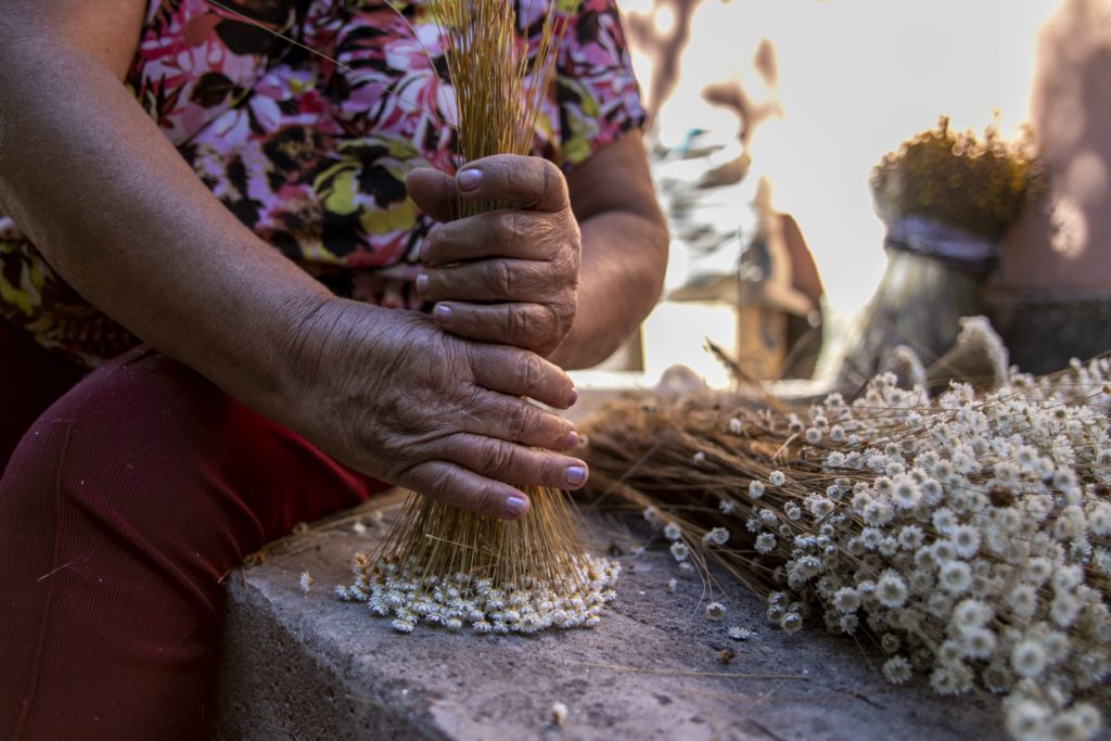 Os Apanhadores de Flores Sempre-Vivas são um dos povos tradicionais do Brasil. A Comunidade Galheiros planta, colhe e vive da panha de flores. Tem uma dinâmica de comercialização muito bem estruturada, com contratos constantes em diversas cidades do país e do exterior. Neste dia, visitamos a casa de Branca e João, ambos apanhadores desde criança. Branca começou aos 8 anos e nunca trabalhou com outra coisa. É uma artista: o modelo de arranjo de flores que está montando aqui, um dos mais vendidos, é criação de Branca.