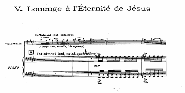 O 5º movimento, “Louvor à eternidade de Jesus”, portanto, é também uma espécie de início – um começo do começo. É o verbo que tudo cria, que não encontra nenhuma força contrária a si mesmo. É isso que também indica Messiaen quando lembra das palavras do evangelho de São João. “No início era o verbo, e o verbo era Deus”. O verbo infinitivo (som dos sons), de onde provém todos os tempos mas que não tem tempo nenhum. A sublimação espiritual da eternidade de Jesus é interrompida pelo anúncio das trombetas do Apocalipse. As 7 trombetas que, quando tocadas, destroem o mundo são apresentadas no 6º movimento, a parte mais característica da obra do ponto de vista rítmico.