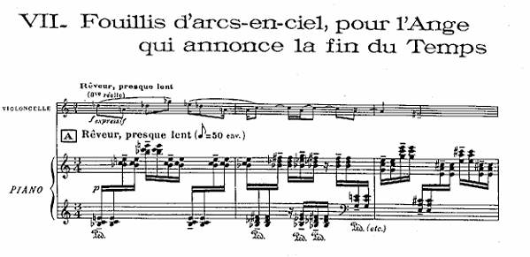 No 7º movimento, o número mais perfeito, um “turbilhão de arco-íris”. O arco-íris, um “símbolo de paz, sabedoria, e de toda vibração luminosa e sonora” – como diz Messiaen – se apresenta junto ao anjo do fim do tempo. É o êxtase após o arrebatamento, o momento da redenção que nos prepara para a vida eterna e que nos conduz a uma volta no círculo, a mais uma integração do caminho. O 8º movimento é o retorno da montanha após o êxtase, uma celebração à humanidade no mistério do espírito de Cristo. Uma volta à carne como espírito, à humanidade de jesus traduzida em um louvor à sua imortalidade. É o jesus-homem, o verbo feito carne.